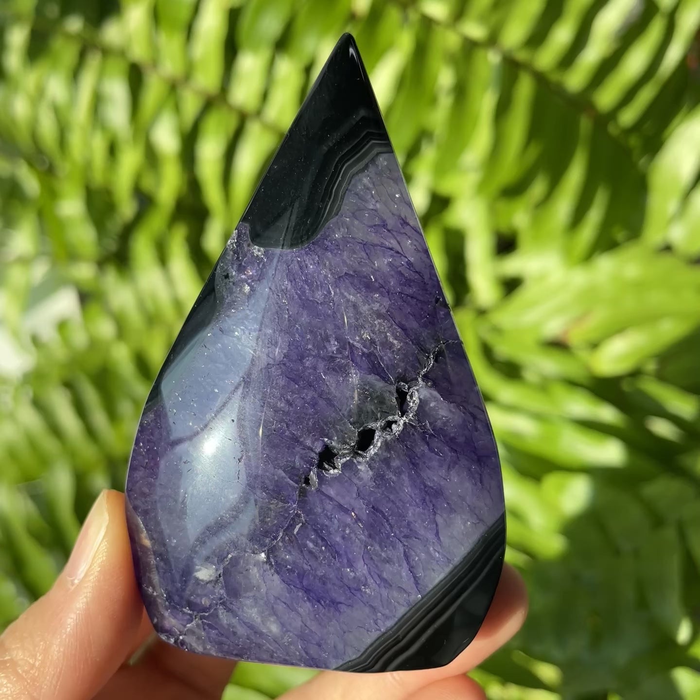 Function: Black and Purple Sardonyx Ornament carries protective and grounding energy, symbolizing strength, balance, and spiritual insight. Smoothly polished to showcase its striking black and purple banded patterns, it is ideal for display, meditation, or daily energy practices. Its bold tones inspire emotional stability, inner confidence, and resilience, helping to dispel negativity, enhance focus, and promote a sense of security and spiritual clarity.