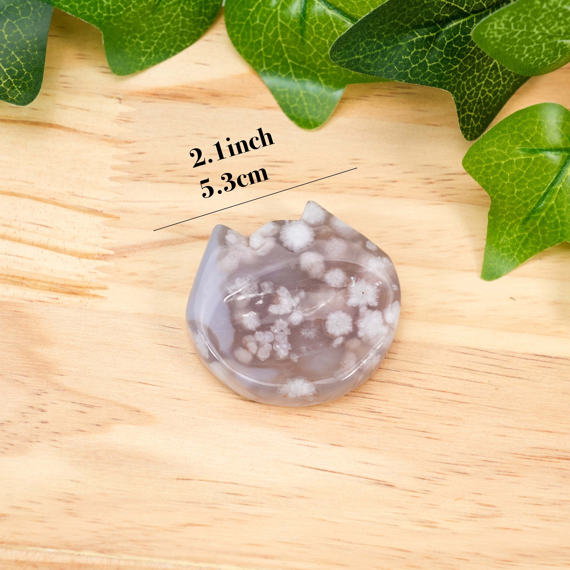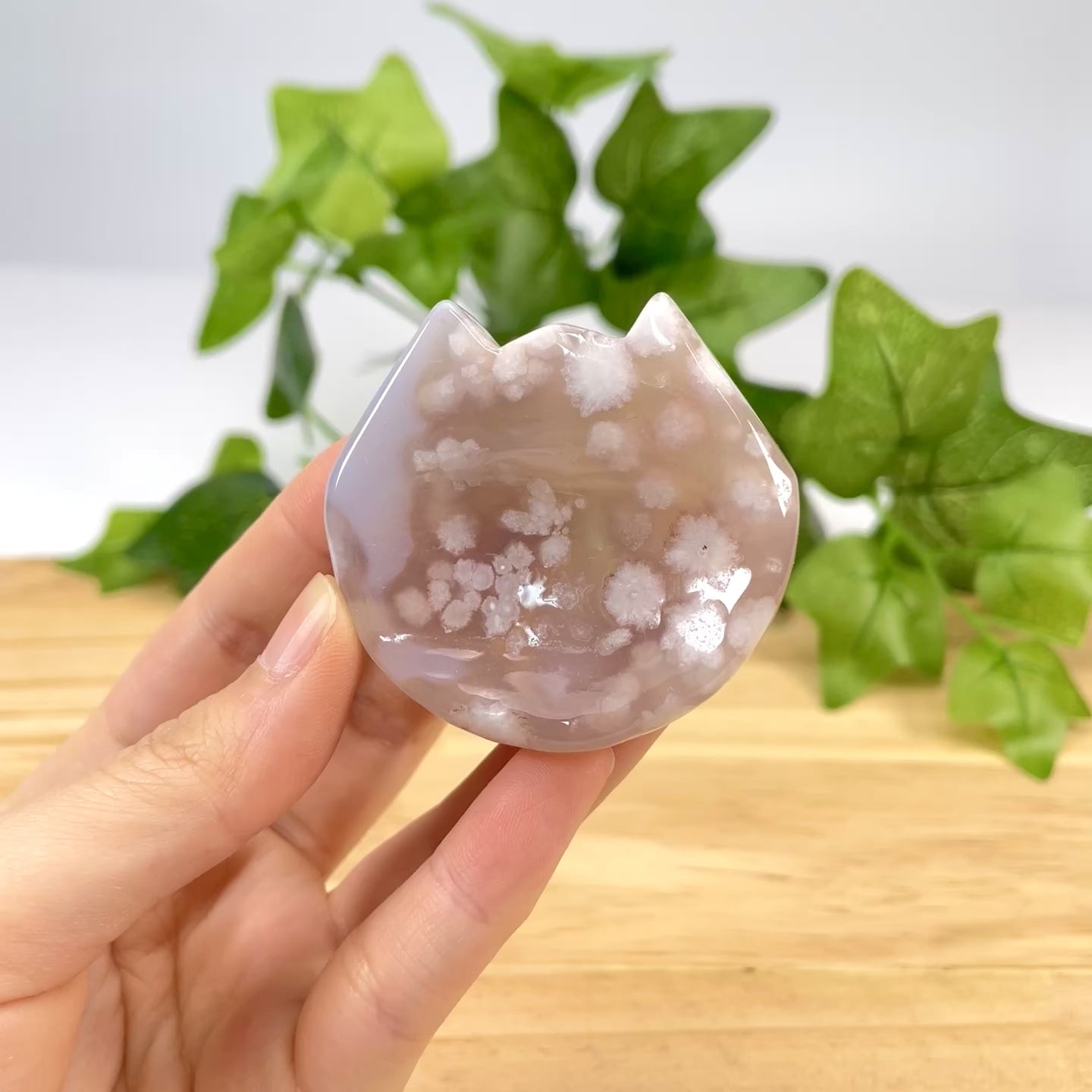 This adorable hand-carved cat head is crafted from natural flower agate (cherry blossom agate), a stone known for its soft, dreamy inclusions that resemble delicate cherry blossoms in bloom. Each piece is one-of-a-kind, with unique patterns, color variations, and natural formations that make your cat carving truly special.