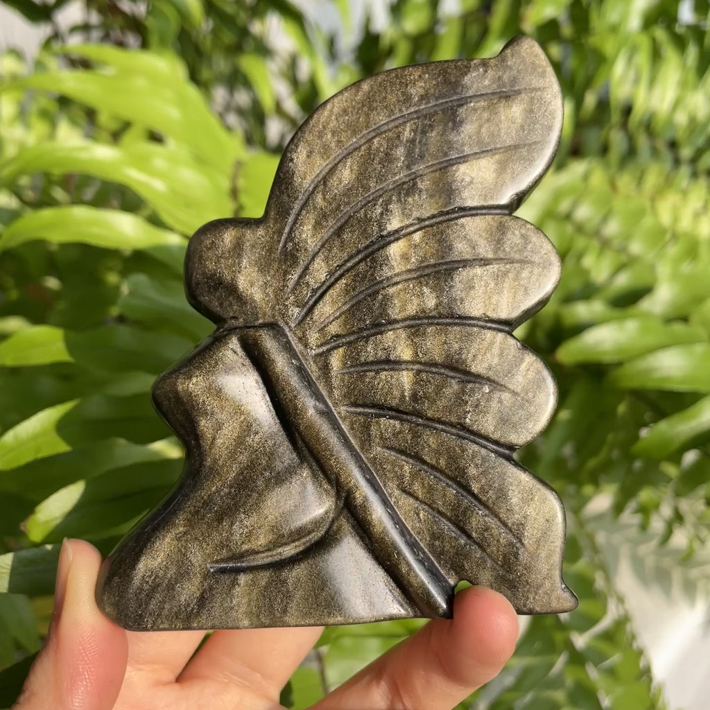 Function: Golden Obsidian Flower Fairy carries protective and empowering energy, symbolizing transformation, inner strength, and positivity. Carved into the delicate form of a flower fairy, it is ideal for meditation, energy work, or enhancing a peaceful and magical environment. Its deep black surface with golden sheen reflects grounding and confidence, helping to dispel negativity, boost self-awareness, and encourage emotional balance.