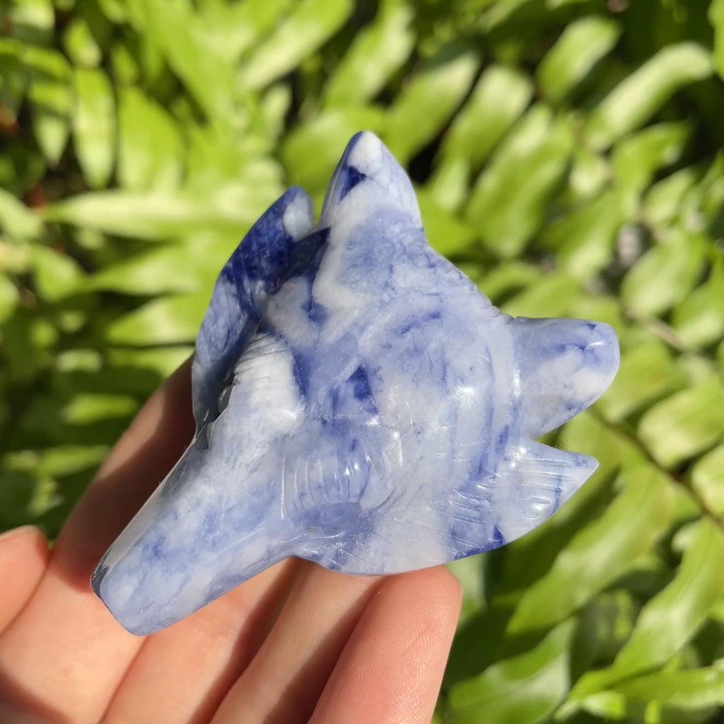 Function: Porcelain Sodalite Wolf carries calming, intuitive, and protective energy, symbolizing wisdom, loyalty, and inner strength. Smoothly polished and intricately carved into a wolf shape, it is ideal for meditation, focus, and spiritual awareness practices. Its soft blue and white porcelain-like tones help quiet the mind, reduce stress, and enhance clarity, intuition, and truthful communication. Porcelain Sodalite is often used to strengthen mental balance, encourage rational thinking, and support emotional harmony, while the wolf symbolism promotes confidence, protection, guidance, and a strong connection to one’s inner instincts.