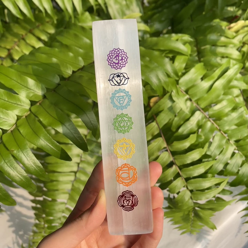 Function: Seven Chakra Selenite Slab carries high-vibrational cleansing and balancing energy, symbolizing harmony, clarity, and spiritual alignment. Embedded with seven chakra stones, it is ideal for meditation, energy cleansing, or chakra balancing practices. Its luminous white selenite base reflects purity and peace, helping to clear negative energy, enhance focus, and promote overall emotional and spiritual balance.