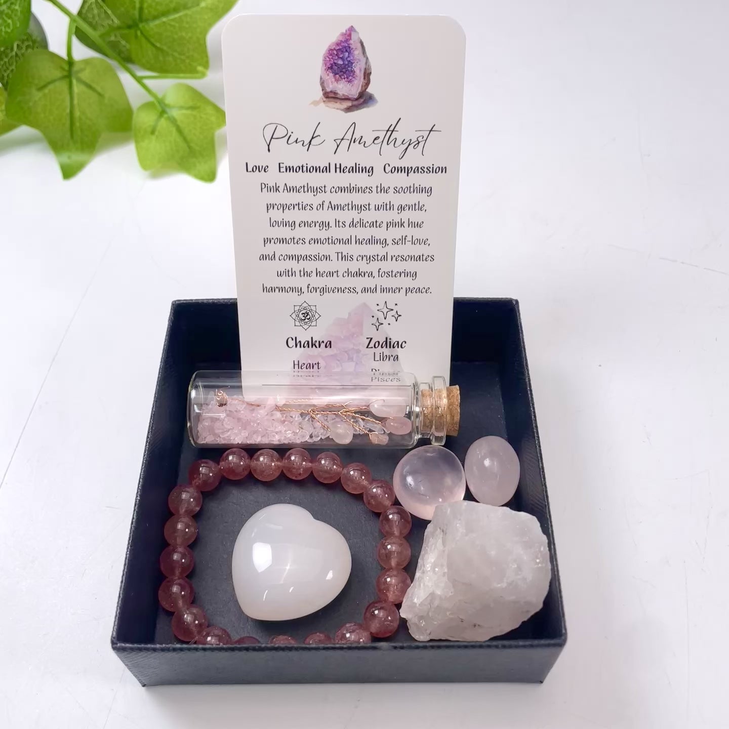 Included: Pink Amethyst/Rose Quartz druzy, "Stone of Love" heart, Strawberry Quartz beads, and a crystal-infused love vial.